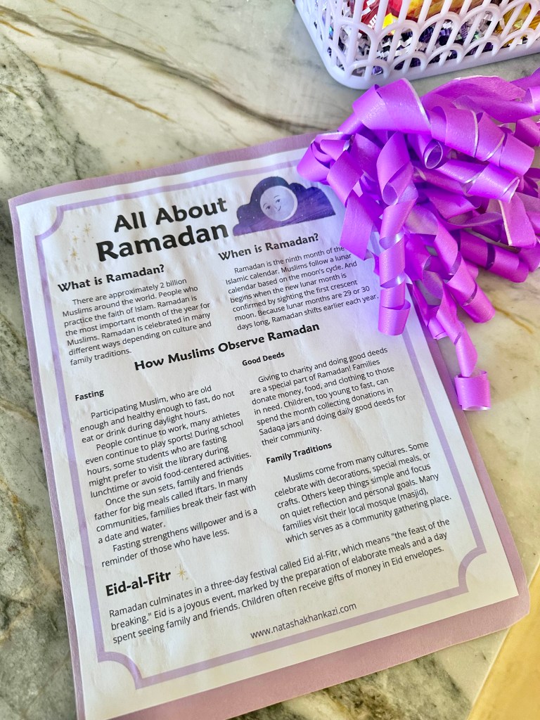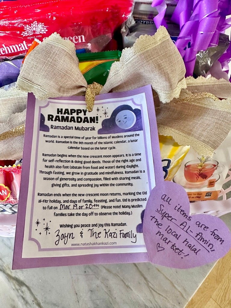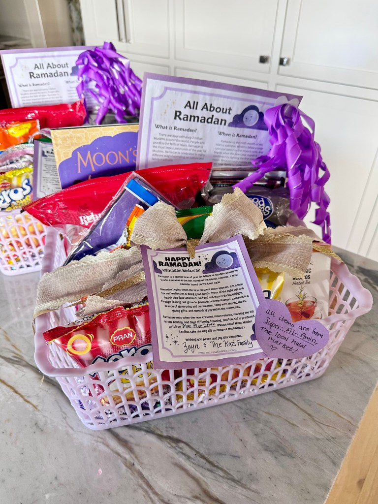 Every year during Ramadan, I put together a basket for the front office staff at my kids’ public school. It’s become one of my favorite traditions. I fill it with snacks from our local halal market, such as chips, biscuits, savory treats, and teas. I love supporting our small businesses, especially our Muslim ones. And honestly, if someone were to gift me a basket of snacks from any ethnic grocery store, that would be AMAZING! (Just putting it out there!)